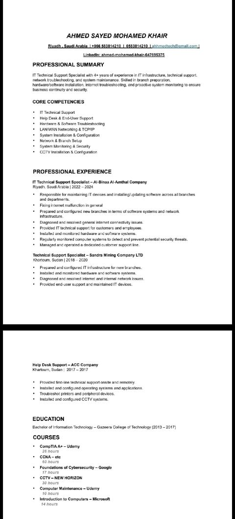 Looking for an opportunity in Computer Networks and IT support. Sudanese nationality, born in Riyadh, holding a Diploma in Computer Networks with a GPA of 4.32/ 5. Completed cooperative training in a charitable organization with hands - on experience in computer maintenance, network setup and management, and user support. Motivated, professional, and eager to develop skills and contribute to a produc