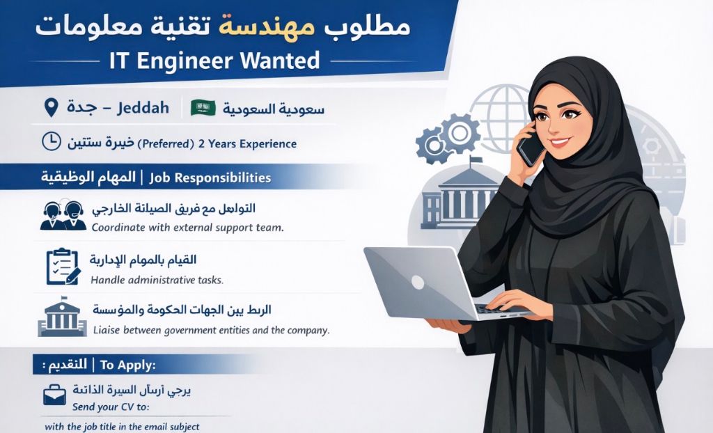 مطلوب مهندسة تقنية معلومات (IT Engineer) الموقع جدة حي الحمراء الجنسية سعودية الخبرة سنتان (يفضل) المهام الوظيفية التنسيق والتواصل مع فريق الصيانة والدعم الفني الخارجي. تنفيذ ومتابعة المهام الادارية المتعلقة بقسم تقنية المعلومات. العمل كحلقة وصل بين الجهات الحكومية والمؤسسة فيما يخص الأنظمة والمتطلبات التقنية. متابعة المراسلات الرسمية والتقارير التقنية ذات الصلة. دعم الإدارة في تنظيم العمليات التقنية