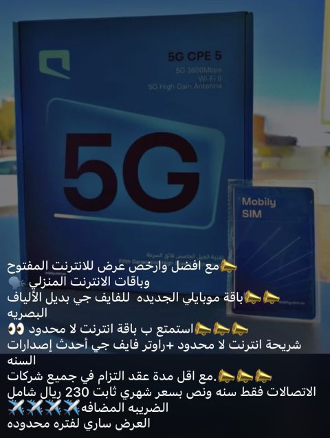 عرض الانترنت 5G لا محدود 230 شهريا المميزات راوتر محمول هدية مع العرض 1 جهاز مجاني 2 شريحة نت مفتوحه لا محدود 3 سرعة التحميل 100 MPS 4 سرعة الرفع 50 MPS 5 التركيب والتوصيل مجاني 6 تجربة يومين مجانيه بدون أي رسوم 7 الدفعه المقدمه 200 ريال مسترده في الشهر الرابع 8 خدمة ما بعد البيع والصيانة مجانيه 9 الكشف عن التغطية والدعم قبل التفعيل للاشتراك