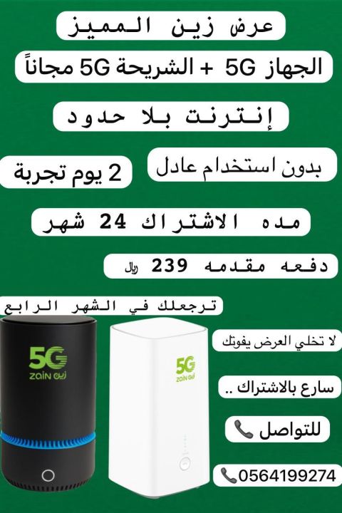 عرض زين المميز الجهاز 5G + الشريحة 5G مجانا انترنت بلا حدود بدون استخدام عادل 2 يوم تجربة مدة الاشتراك 24 شهر دفعه مقدمه 239 ريال ترجعلك في الشهر الرابع شهر مجاني لا تخلي العرض يفوتك سارع بالاشتراك. زين لي الزين للتواصل