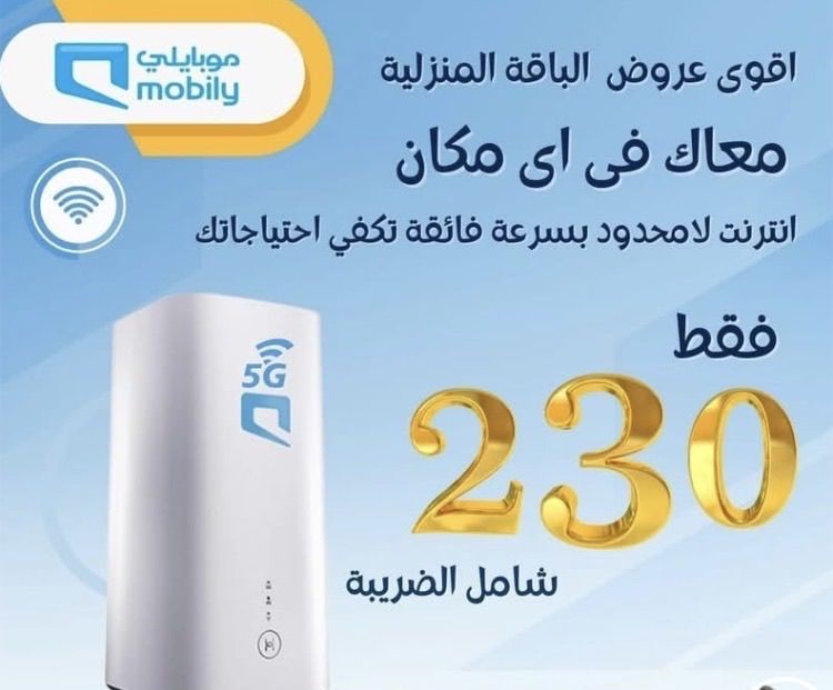 راوتر Mobily 5G حل عملي لانترنت أسرع وتجربة استخدام أكثر ثبات سرعة 5G مناسبة للتصفح، المشاهدة والعمل عن بعد حسب التغطية أداء مستقر مع تشغيل أكثر من جهاز راوتر حديث يغطي مساحة جيدة داخل المنزل امكانية تجربة الخدمة لمدة يومين طبقا لسياسة الشركة السعر يبدأ من 230 ريال قد يختلف حسب الباقة ونوع العرض فحص تغطية قبل التركيب توصيل متاح تواصل معنا لمعرفة التفاصيل