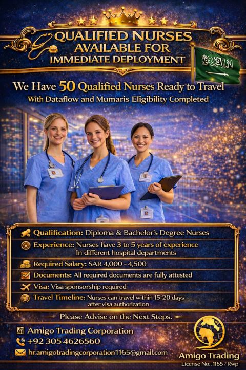 ممرضون متاحون من باكستان يتوفر لدينا 50 ممرضا وممرضة جاهزين للسفر، وقد اكملوا اجراءات الداتا فلو وحصلوا على أهلية ممارس (بلس) يمتلك جميع المرشحين خبرة من 3 الى 5 سنوات في مختلف الأقسام الطبية. متطلبات الراتب من 4000 الى 4500 ريال سعودي. بعد اعتماد التأشيرة، يمكن للمرشحين السفر خلال 20 الى 25 يوما. للاستفسار والتنسيق، يرجى التواصل معنا عبر الواتساب شركة أميكو للتجارة الترخ