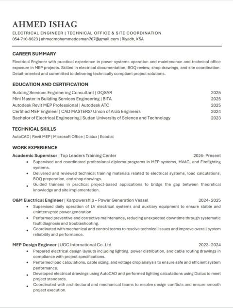 مهندس كهرباء MEP (مكتب فني، موقع، صيانة وتشغيل) خبرة 3 سنوات