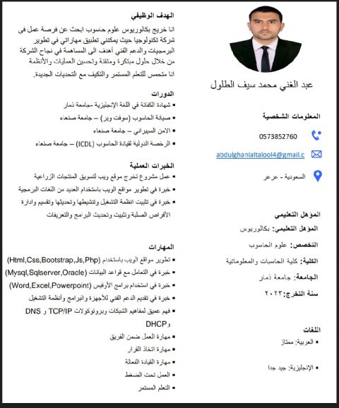 أنا عبد الغني الطلول، يمني الجنسية، متخصص في علوم الحاسوب مع خبرة في ادخال البيانات وتحليلها. مهارات قوية في استخدام ورد، اكسل وباور ابحث عن فرصة عمل في مجال تخصصي أو اعمل في مكتبه أو خدمات عامة أو كاشير