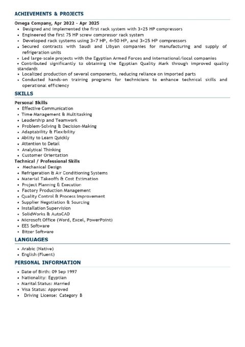 An ambitious Mechatronics and Robotics Engineer holding a Bachelor's degree with a Good grade. I possess advanced technical skills in machine maintenance, handling electrical and electronic circuits, and Industrial production lines. I am passionate about continuous learning and developing intelligent systems, programming, and advanced technical solutions