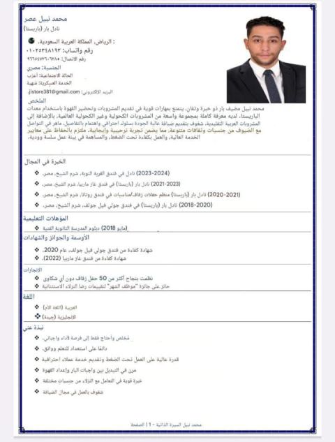 Looking for a waiter or bartender position. I have experience working in several 5 - star hotels in Sharm El Sheikh, Egypt. I have over 3 years of experience in hospitality and dealing with different cultures. I am passionate about my work and can work well under pressure. I have a valid professional residency permit and am currently located in Riyadh. I can write and speak English at a 60% level an