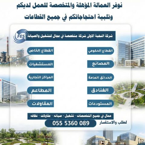 نحن شركة النخبة الأولى لتشغيل والصيانة نعلن عن توفير عمالة مهنية داخل المملكة نظام عقد تشغيل وصيانة معلم بناء - معلم تلييس - معلم جبسون بورد - معلم كهرباء - معلم سباكة - معلم بلاط وعمال مطاعم وعمال نظافة داخلية وعمال نظافة حدائق ومستشفيات وفنادق ومصانع وتحميل وتنزيل ومغاسل سيارات كما يوجد عمال بخبرات وكفاءة عالية الجودة