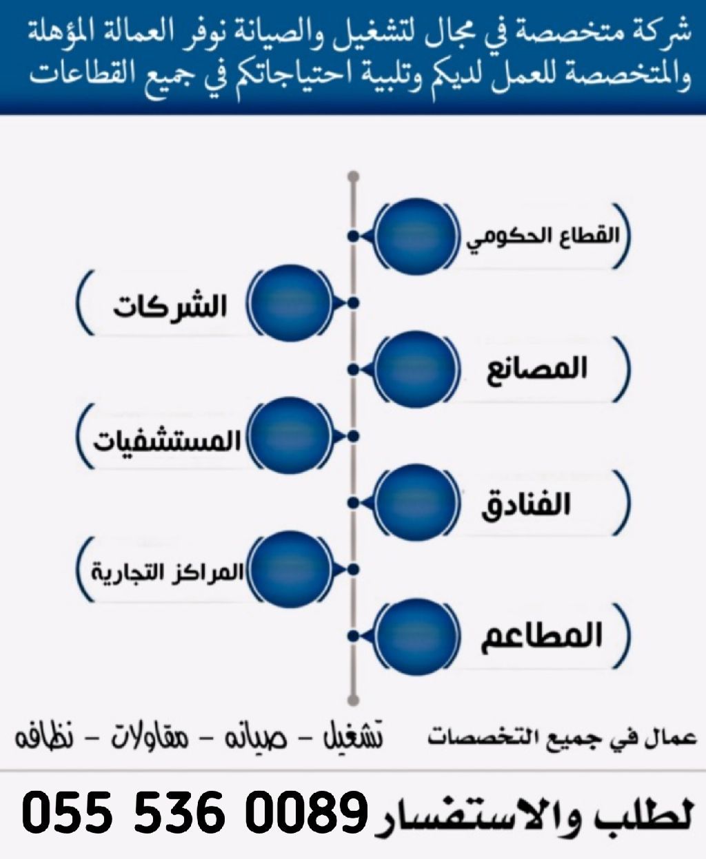 نحن شركة النخبة الأولى لتشغيل والصيانة نعلن عن توفير عمالة داخل المملكة نظام عقد تشغيل وصيانة عمالة لجميع الأشغال والتخصصات عمال مطاعم وعمال نظافة داخلية وعمال نظافة حدائق ومستشفيات وخدمات مقاولات وفنادق ومصانع وتحميل وتنزيل ومغاسل سيارات كما يوجد عمال بخبرات وكفاءة عالية الجودة