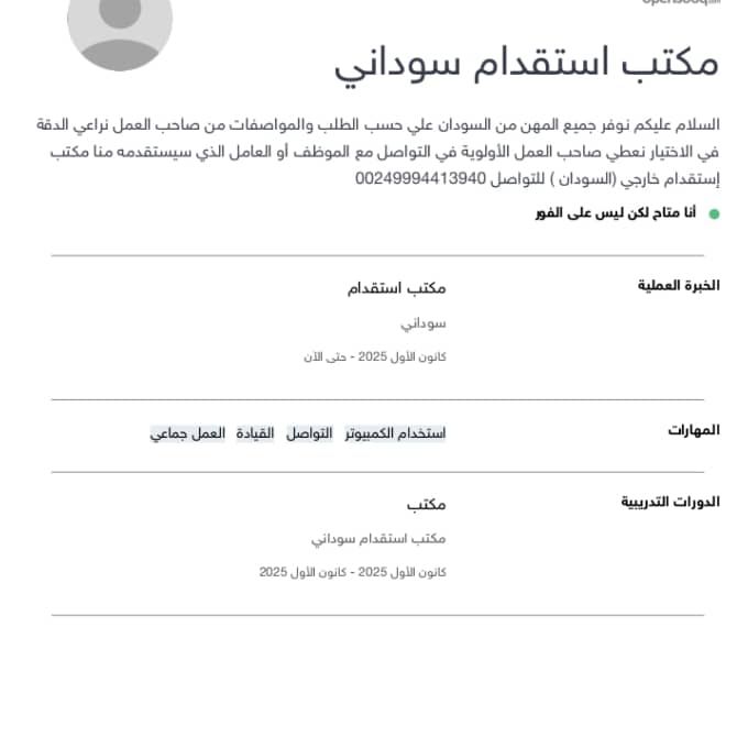 نوفر جميع المهن من السودان على حسب الطلب والمواصفات من صاحب العمل نراعي الدقة في الاختيار نعطي صاحب العمل الأولوية في التواصل مع الموظف أو العامل الذي رواعيه غنم وابل خبرة عمال مغاسل سائقين محاسبين سيستقدمه منا مكتب استقدام خارجي (السودان) فترة الاستقدام 15 يوم من تفويض التأشيرة على المكتب للتواصل