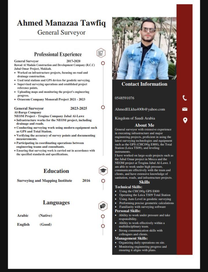 مساح متواجد في تبوك. ابحث عن عمل في أي مكان بالمملكة. سبق لي العمل في مشروع جبل عمر شركة رواد المدائن R C للانشاء والتعمير. كما سبق لي العمل أيضا بالعمل في نيوم تر وجينا جبل اللوز. صرف وطرق بنية تحتية
