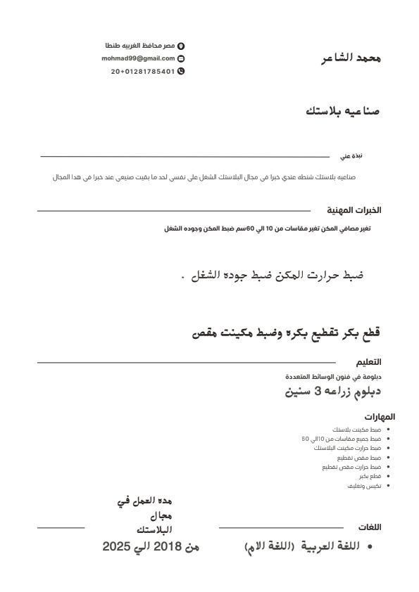 أنا محمد إبراهيم الشاعر من مصر وفني مكنة دبل وسنجل وشغال حاليا في جدة ومستني أشوف مصنع ثاني