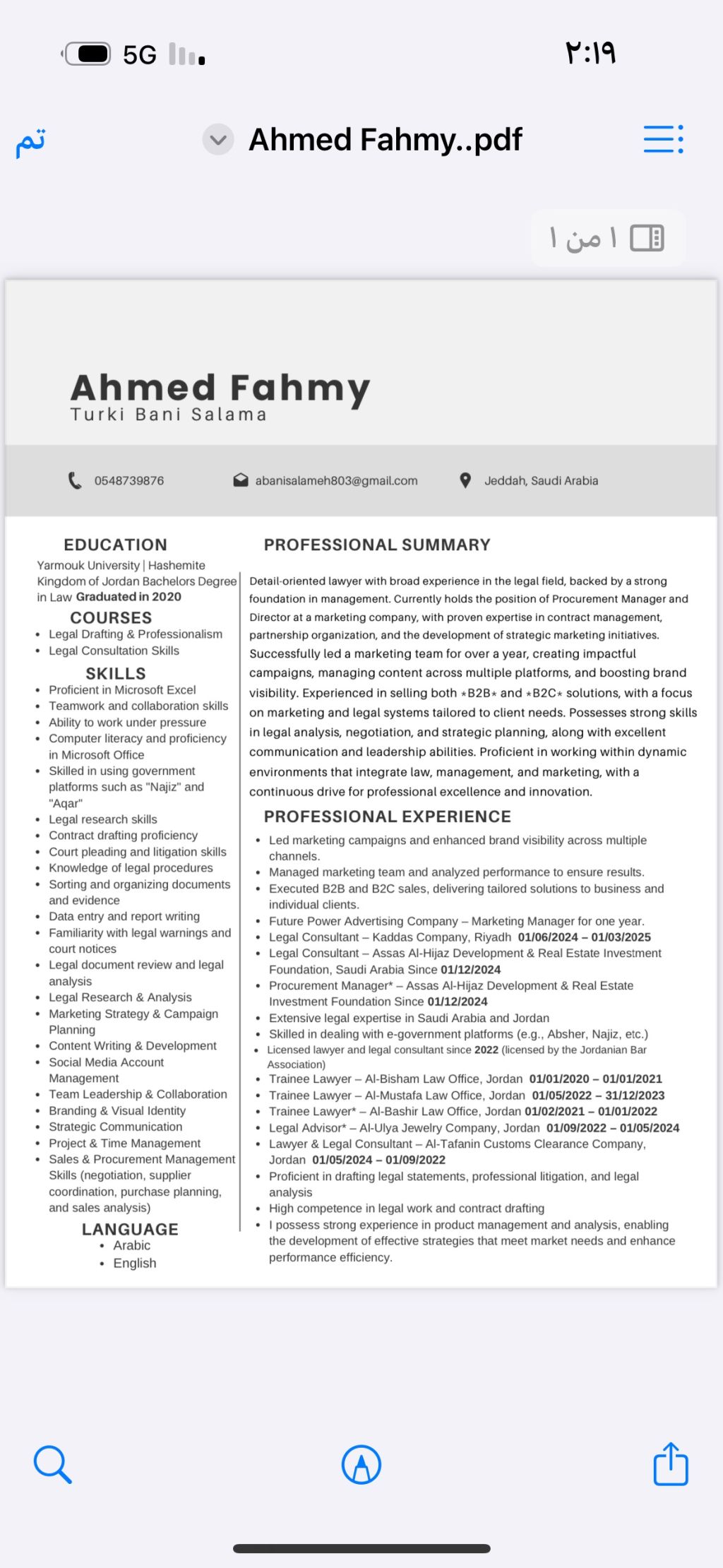 أحمد فهمي تركي بني سلامة محام أردني بخبرة تزيد عن 5 سنوات، منها أكثر من سنتين في المملكة العربية السعودية. متمرس في الاستشارات القانونية وصياغة العقود وتمثيل العملاء، مع معرفة معمقة بالأنظمة السعودية
