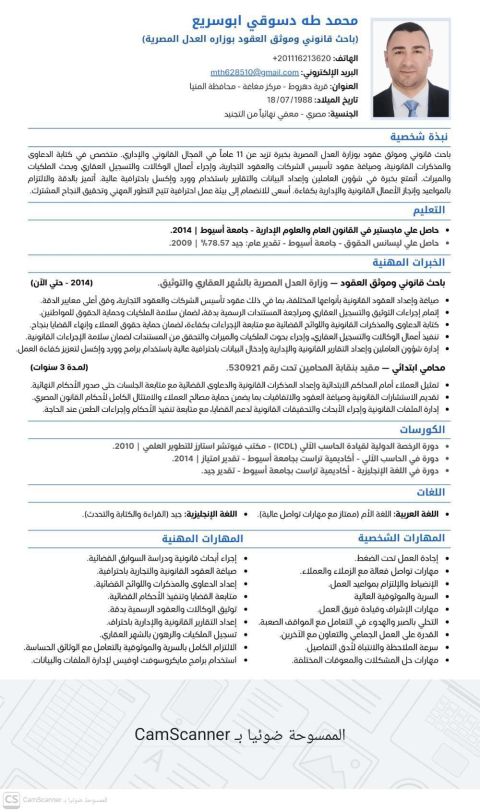 أنا حاصل علي كلية حقوق. وابحث عن عمل في مجال المحاماة والحقوق. أن اشتغلت محامي حر لمدة ثلاث سنوات. عضو لدي اتحاد محامين العرب. وعضو لدي نقابة المحامين المصرية. واشتغلت أمين خزينة في شركة هاما للصناعات الطبيعية الغذائية. واشتغلت مساعد مدير عام في مصنع ملابس. واشتغلت مدخل بيانات لدي مجموعة صيدليات طيبة