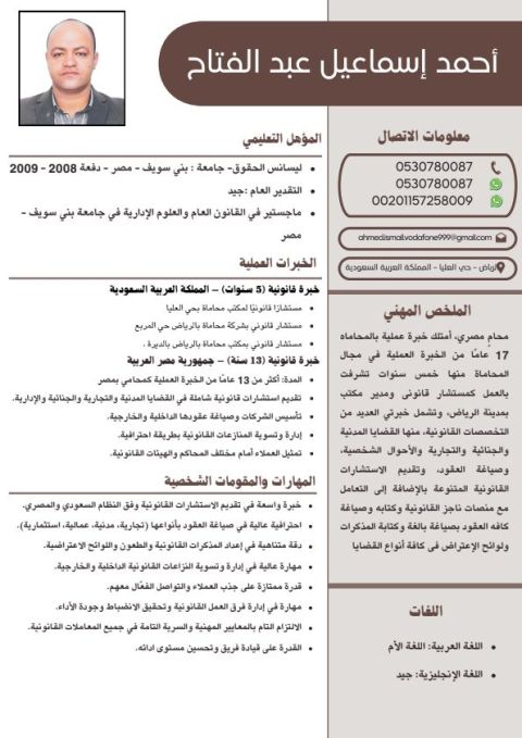 مستشار قانوني مصري حاصل على ليسانس الشريعة والقانون جامعة الأزهر في القاهرة عام 2006 بتقدير جيد جدا وماجستير القانون العام عام 2008 على خبرة كبيرة بالعمل القانوني بالمملكة من دراسة العقود وكتابتها بجميع أنواعها وكذا دراسة القضايا وابداء الرأي فيها وكتابة المذكرات القانونية بجميع أنواعها وعملت مستشارا قانونيا لدى الكثير من مكاتب المحاماة وشركات المقاولات بالمملكة أرغب في الالتحاق بعمل مناسب