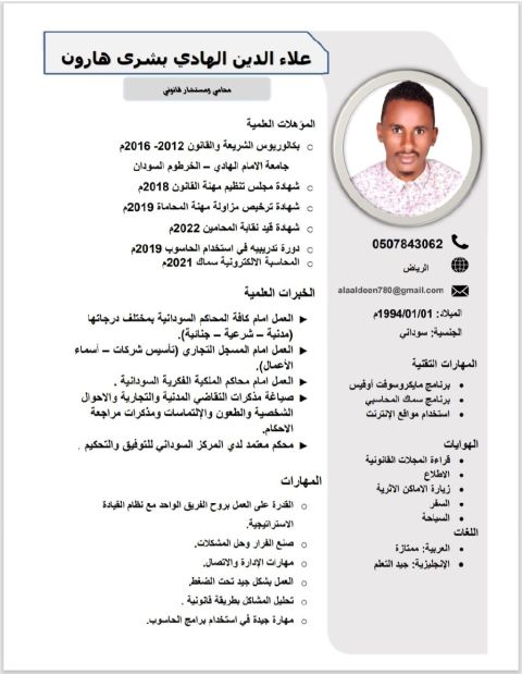محامي ومستشار قانوني سوداني مقيم في الرياض ابحث عن عمل، امتلك شغفا بالمهنة وقدرة على التحليل واعداد التقارير وتنظيم الملفات ومتابعة القضايا، وتنسيق الجلسات والتواصل مع العملاء والجهات الرسمية والحرص على السرية والدقة في انجاز المهام والتعامل مع المنصات الحكومية