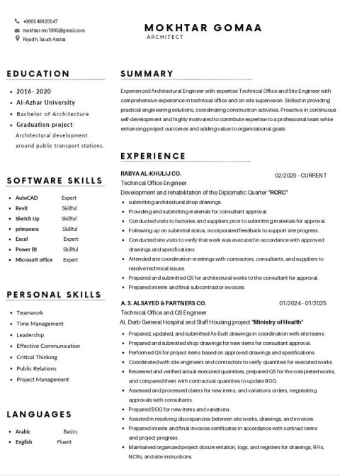 مهندس معماري خبرة بأعمال المكتب الفني والاشراف على التنفيذ - Shop Drowing الحصر وحساب الكميات QS - المستخلصات - as built الاشراف على بنود التشطيبات المعماريه التعامل مع الاستشاري وتقديم الاعتمادات المطلوبه RFI, MS, IR