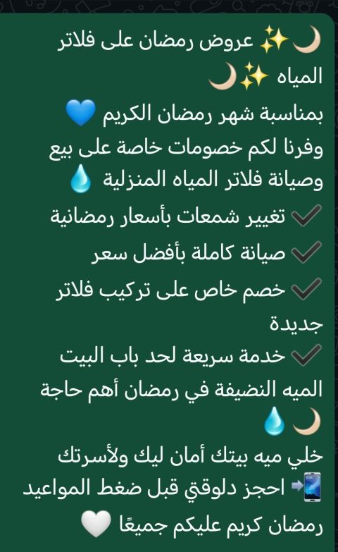 نتقدم اليكم بعرض رمضان علي الفلاتر المنزليه والبردات ومحطات التحلية ووجميع قطع غير الفلاتر والمحطات المركزيه