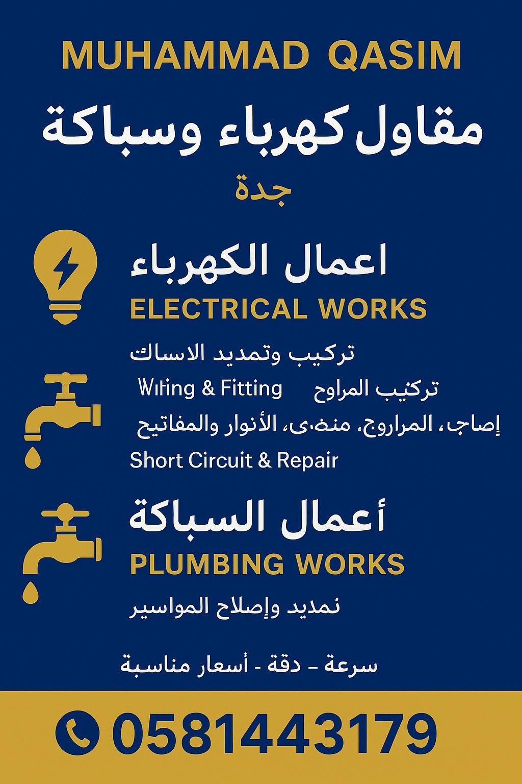 Muhammad Qasim - مقاول كهرباء وسباكة جدة - Jeddah خدماتنا/ Our Services أعمال الكهرباء Electrical Works تركيب وتمديد الأسلاك (Wiring & Fitting) تركيب المراوح الأنوار والمفاتيح (Fan Light, Switch Installation) اصلاح الأعطال الكهربائية (Short Circuit & Repair) أعمال السباكة / Plumbing Works تمديد واصلاح المواسير (Pipe Fitting & Leakage Repair) تركيب موتور المياه والخزانا
