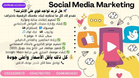 عندك مؤسسة أو شركة أو متجر الكتروني أدير ليك كل ما يخص سوشيال ميديا واسوي ليك هوية بصرية كاملة ومحتوي يجيب لك عملاء ويزود مبيعاتك سواء صور أو فيديو نسوي لك خطة تسويقية قوية بنعزز ظهورك رقمي بنسوي لك حملات اعلانية علي حسب نشاطك ونخليك تحقق مبيعات قوية كلموني الحين