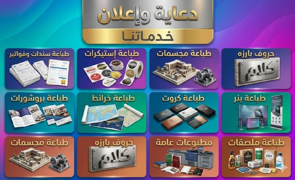 حروف بارزة طباعة مجسمات طباعة سندات وفواتير طباعة إستيكرات طباعة بنر طباعة كروت، طباعة خرائط طباعة ملصقات مطبوعات عامة طباعة بروشورات شغل بشكل احترافي نوفر لك أفضل جودة بأفضل سعر 100 تصميمات جذابة + طباعة واضحة والوان ثابتة للتفاصيل والأسعار ابعت رسالة وابشر