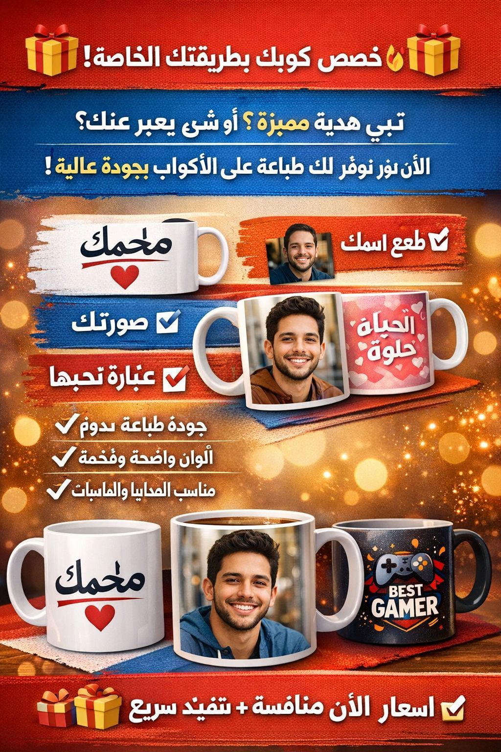خصص كوبك بطريقتك الخاصة تبي هدية مميزة أو شيء يعبر عنك الآن نوفر لك طباعة على الاكواب بجودة عالية اطبع اسمك صورتك عبارة تحبها أو حتى تصميم خاص فيك جودة طباعة تدوم الوان واضحة وفخمة مناسب للهدايا والمناسبات أسعار منافسة + تنفيذ سريع أطلب الآن وخلي كوبك يحكي قصتك