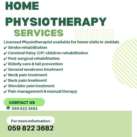 أخصائي علاج طبيعي مرخص يقدم زيارات منزلية في جدة لجميع الأعمار. خدماتنا تأهيل مرضى الجلطات الدماغية، رعاية المرضى طر يحي الفراش، علاج التصلب اللويحي (MS) تأهيل الاطفال بالشلل الدماغي (CP) التأهيل بعد العمليات، رعاية كبار السن، علاج الضعف العام وآلام الرقبة والظهر والكتف، والعلاج اليدوي