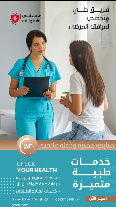 لخدمات التمريض المنزلي، المرافقين، العلاج الطبيعي، ورعاية كبار السن تحتاج ممرض أو مرافق بالبيت أحنا نجيك وين ما كنت الوصف نقدم رعاية انسانية وصحية عالية الجودة لكبار السن والمرضى، أفضل أخصائيين علاج طبيعي، لدينا طاقم كامل مؤهل ومدرب الوصف 2 رعاية منزلية متكاملة تمريض، علاج طبيعي، وجليسات لكبار السن بأيدي مختصين وبأسعار تناسب الجميع التواصل جوال أو وتس