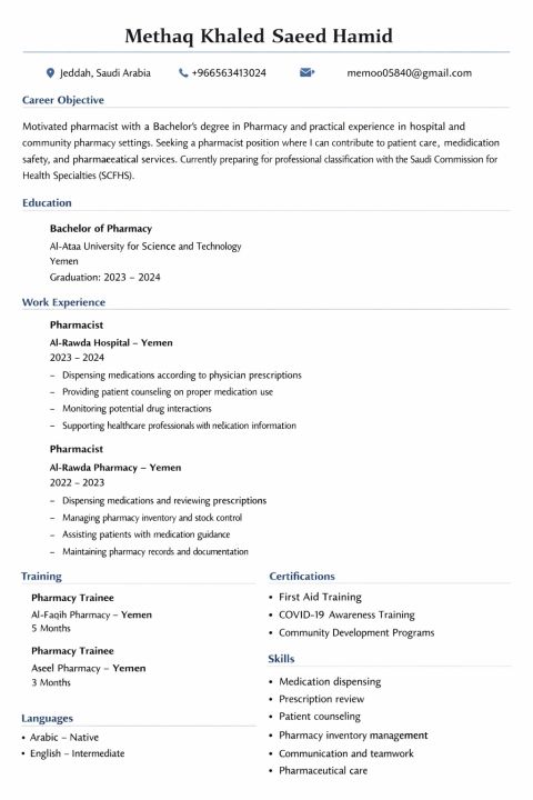 صيدلي متاح للتوظيف - جدة ميثاق خالد سعيد حميد بكالوريوس صيدلة - جامعة العطاء للعلوم والتكنولوجيا خبرة مستشفى وصيدلية الروضة - اليمن جدة - السعودية + جاهز للتوظيف فورا، ومستعد للتصنيف المهني (SCFHS)