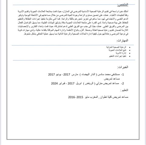ممرضة منزلية خبرة 7 سنوات في مجال التمريض في المملكة العربية السعودية إقامة سارية ابحث عن عمل أجيد الرعاية الصحية المنزلية تتبع العلامة الحيوية ادارة الادوية تركيب جهاز الأكسجين (BiPAP) وCPAP) لعلاج الانقطاع التنفس أثناء النوم وكل رعاية التي يحتاجها المريض أثناء علاجه في البيت