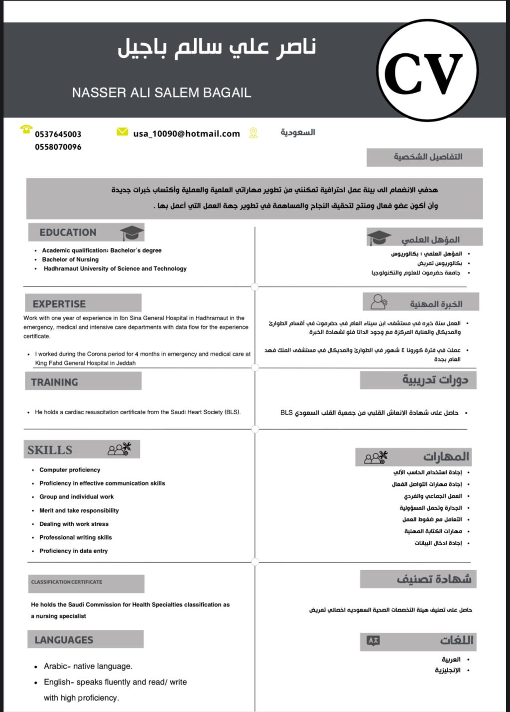بكالوريوس أخصائي تمريض مصنف من هيئة التخصصات السعودية لدي خبرة ولدي شهادات من وزارة الصحة وشهادات دورات وشهادة خبرة من شركة أيلاف عملت في عيادة رغبة العمل في مشروع أو مستوصف مواليد السعودية إقامة خاصه