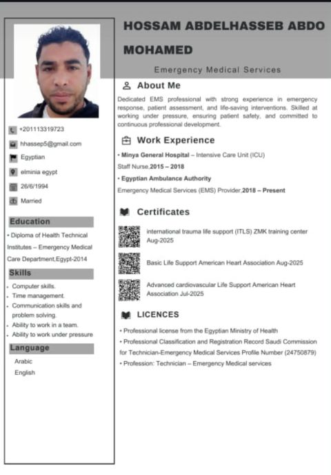 فني خدمات طبية عاجله خبرة 6 سنوات في هيئة الاسعاف المصريه ابحث عن عمل في أي مكان داخل المملكة