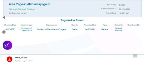متوفر طبيبة عامة سودانية مقيمة بالمملكة حاصله علي ترخيص الهيئة السعودية خبرة سنة طبيب عام مستعدة للعمل في جميع مناطق المملكة