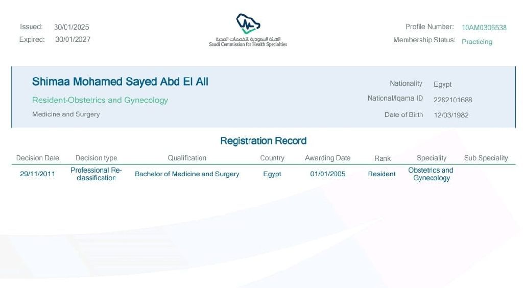 Obs & gyn RESIDENT female Valid Saudi Commission as OBS & GYN RESIDENT 16 years Experience AND DEPLOMA IN AESTHETIC (COSMOTIC) GYNECOLOGY 13 years in KSA One year in Saudi German Hospital Aseer region. 7 years in Maternity Hospital Madina Monwarah. 3 years in Dallah Hospital Riyadh. 5 year in private polyclinic in Jeddah until now. Transferable Iqama Only in Jeddah