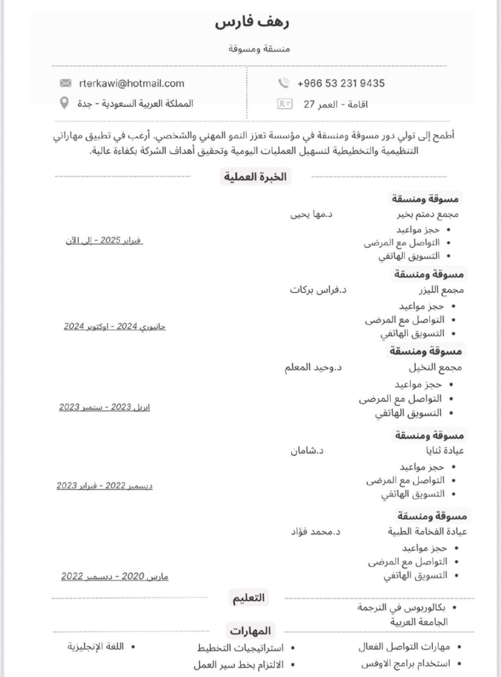 منسقة طبيب أسنان خبرة بالتنسيق أكثر من 5 سنوات