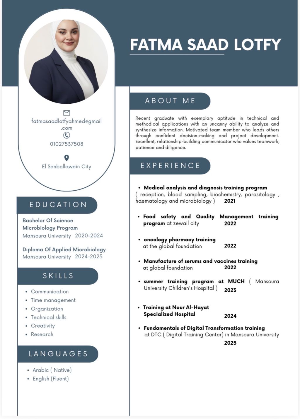 أخصائية ميكروبيولوجي وتحاليل طبية 23 عام حديثة تخرج بكالوريوس علوم جامعة المنصوره لدي خبرة عام في مجال التحاليل الطبية الكيميائية وحاصله علي دبلومه في الميكروبيولوجيا التطبيقية جامعة المنصوره بتقدير عام جيد جدا ابحث عن وظيفة بدوام كامل داخل مدينة جدة