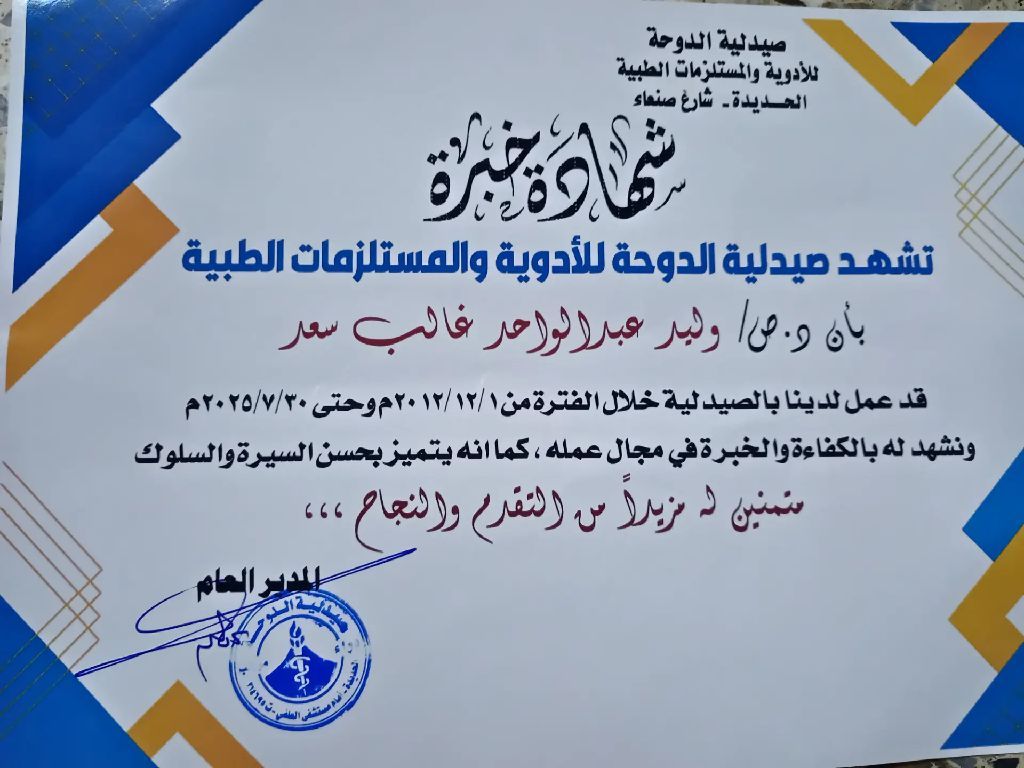 وليد عبدالواحد غالب يمني الجنسية دبلوم عالي 3 سنة صيدلة أطلب عمل في مجال الصيدلة مساعد صيدلي أو في مستودع للادوية لي خبرة في مجال العمل كمساعد صيدلي وصارف للادوية مدتها 13 سنة يمكن التعامل مع الكمبيوتر في ادخال الادوية ومتابعات صلاحيتها ونواقصها