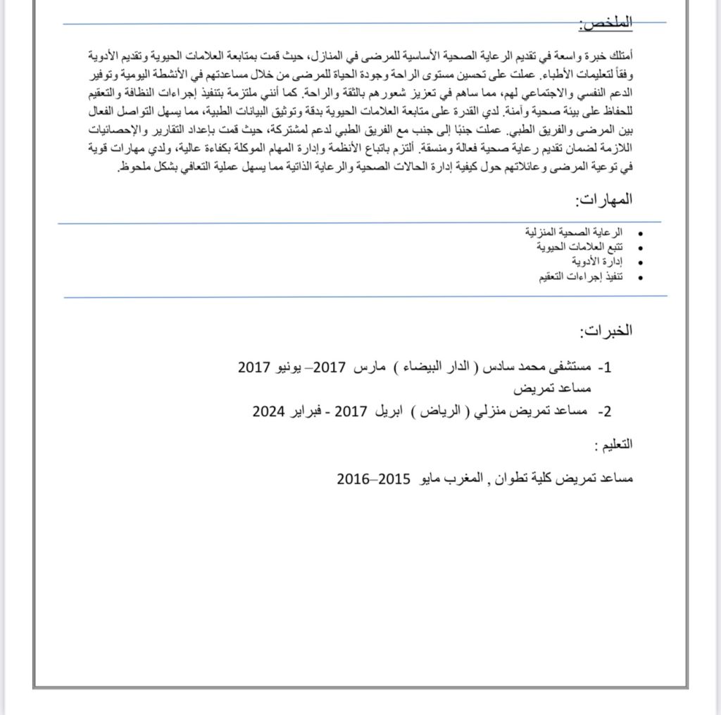 ممرضة منزلية خبرة 7 سنوات في مجال التمريض في المملكة العربية السعودية إقامة سارية ابحث عن عمل أجيد الرعاية الصحية المنزلية تتبع العلامة الحيوية ادارة الادوية تركيب جهاز الأكسجين (BiPAP) وCPAP) لعلاج الانقطاع التنفس أثناء النوم وكل رعاية التي يحتاجها المريض أثناء علاجه في البيت