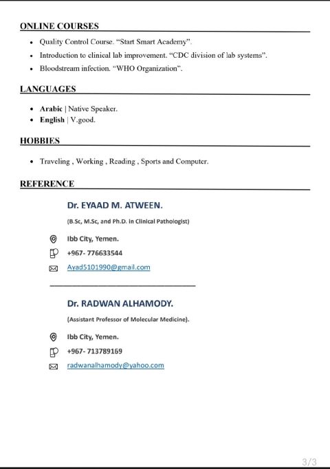 أخصائي مختبرات طبية مرخص ومؤهل وملتزم بتقديم رعاية صحية متميزة للمرضى. لدي خبرة ثلاث سنوات في مجال المختبرات، وامتلك مهارات قوية في أقسام المختبرات. أنا أؤمن بأن مهاراتي وخبراتي ستكون اضافة قيمة لفريق العمل، وأنا متحمس للعمل في بيئة مهنية ومحفزة. أتطلع الى الفرصة للعمل معكم وأود أن أشكركم على وقتكم وجهدكم. اشتغلت ولدي خبرة على اجهزة كثيرة منها Cobase e411 cobase 311 biosystem BA200, biosystem A15