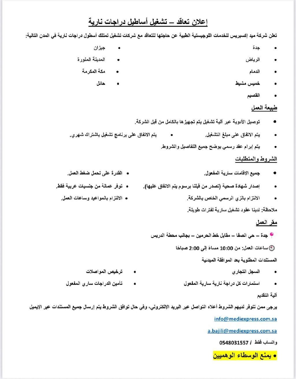 تعلن شركة ميد إكسبريس للخدمات اللوجيستية الطبية عن حاجتها للتعاقد مع شركات تشغيل تمتلك أسطول دراجات نارية