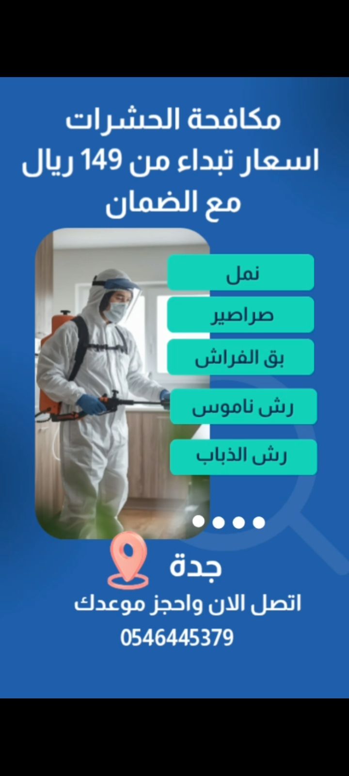 مكافحة جميع أنواع الحشرات المنزلية بأفضل الأسعار والخصومات مع الضمان مكافحة الصراصير مكافحة النمل مكافحة الناموس مكافحة بق الفراش