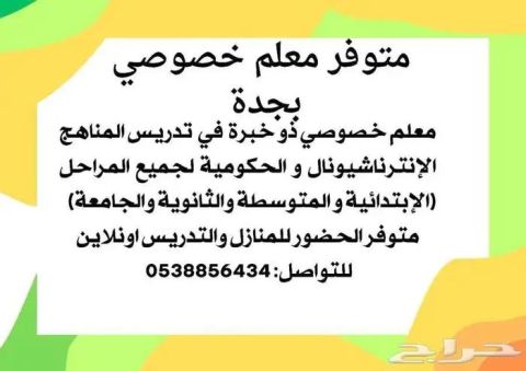 معلم سوري الجنسية تأسيس ومتابعة وقراءة وكتابة وتدريس جميع مواد المرحلة الابتدائية (عربي رياضيات إنكليزي) وجميع مواد المرحلة المتوسطة للتواصل والاستفسار أو على الرقم السعر الشهري للطالب ضمن الجروب 500 ريال ودورة خاصة 1000 ريال