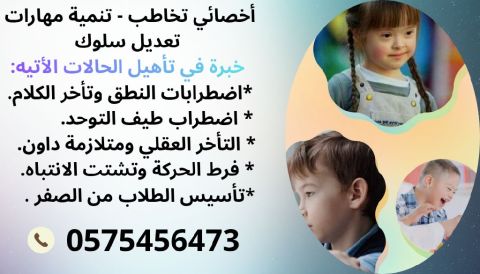 أخصائي تخاطب - تنمية مهارات - تعديل سلوك لاطفال التوحد ومتلازمة داون والتأخر العقلي