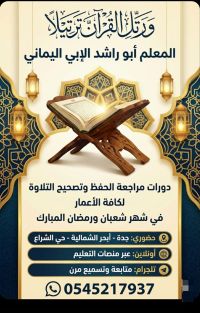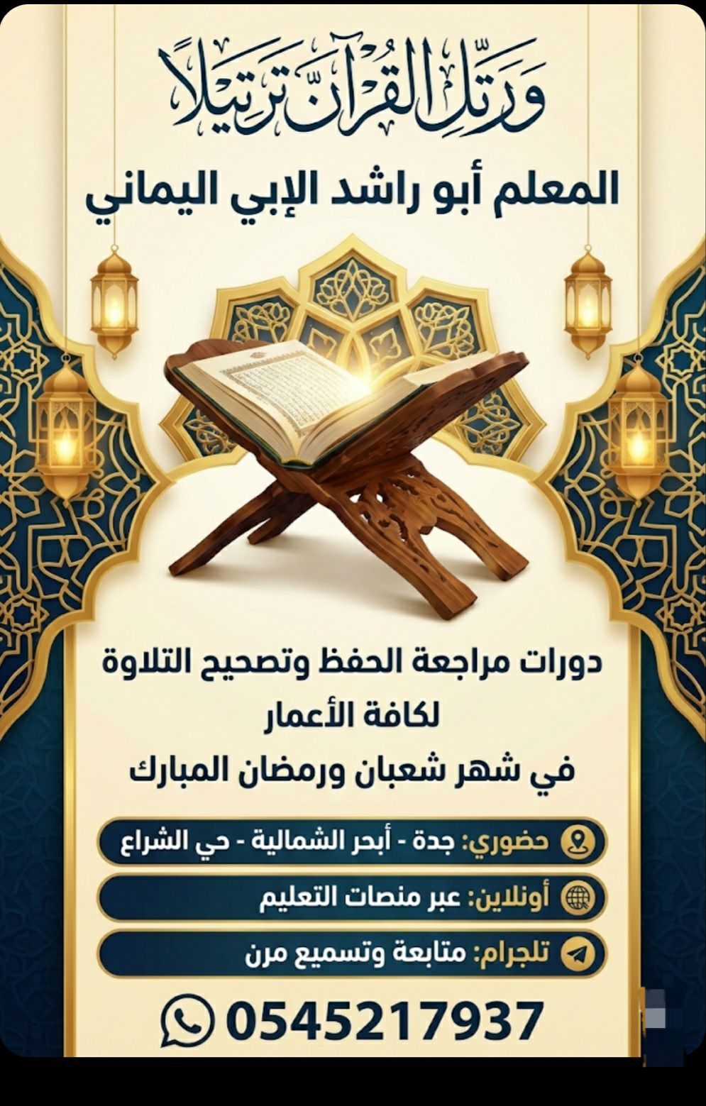 مدرس خصوصي ومصمم (قرآن كريم، متابعة الطلاب، تعليم القراءة والكتابة، تعليم مبدئ العلوم الشرعية، مراجعة قرآن كريم، مصمم جرافيك. وتفريغ وترتيب وتصحيح وتصميم الخطب والدروس والبحوث العلمية) حضوري أو عن بعد أولاين. الموقع جدة حي أبحر الشمالية