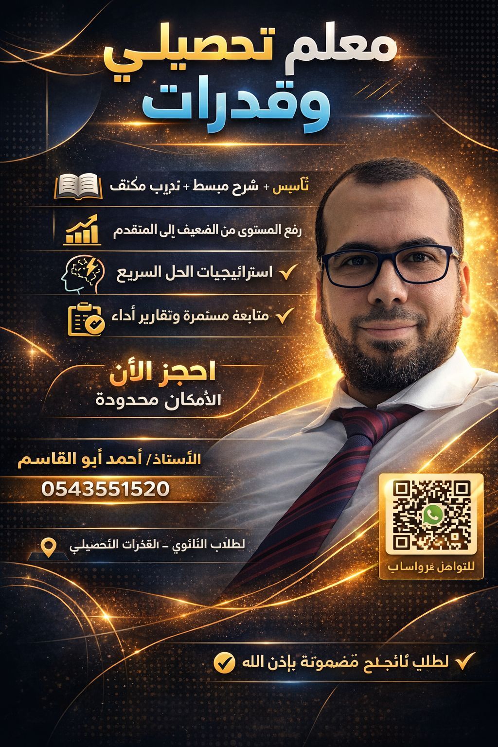 معلم رياضيات وقدرات كمي ولفظي خبرة 14 سنة في مجال التدريس التدريب على أحدث النماذج متابعه مستمرة مع الطلاب حتى ليلة الاختبار