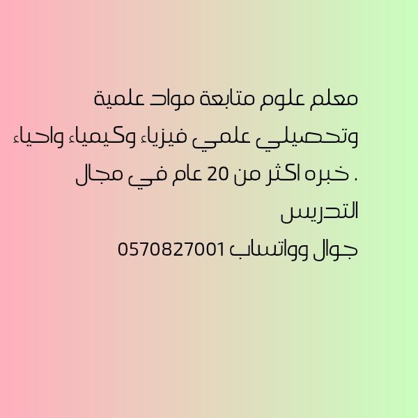 معلم متابعة علوم ومواد علمية خبرة أكثر من 20 عام في مجال التدريس خبرة في التحصيلي العلمي كيمياء وفيزياء وأحياء. وتدريس المواد الجامعية