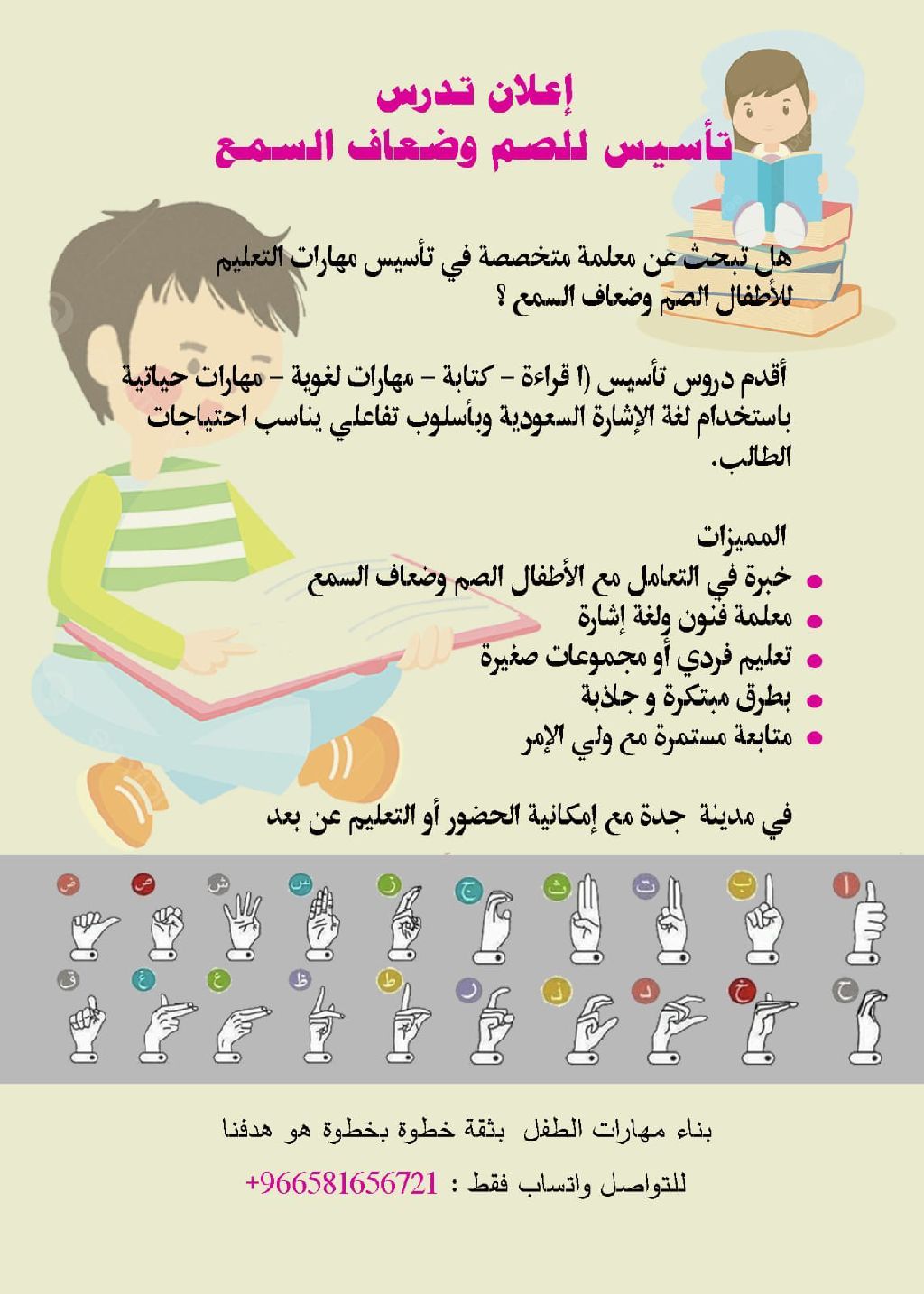 تدريس تأسيس للصم وضعاف السمع هل تبحث عن معلمة متخصصة في تأسيس مهارات التعلم للاطفال الصم وضعاف السمع أقدم دروس تأسيس (قراءة - كتابة - مهارات لغوية - مهارات حياتية) باستخدام لغة الاشارة السعودية وبأسلوب تفاعلي يناسب احتياجات الطالب. المميزات خبرة في التعامل مع الاطفال الصم وضعاف السمع "معلمة فنون ولغة اشارة" تعليم فردي أو مجموعات صغيرة بطرق مبتكرة وجاذبة