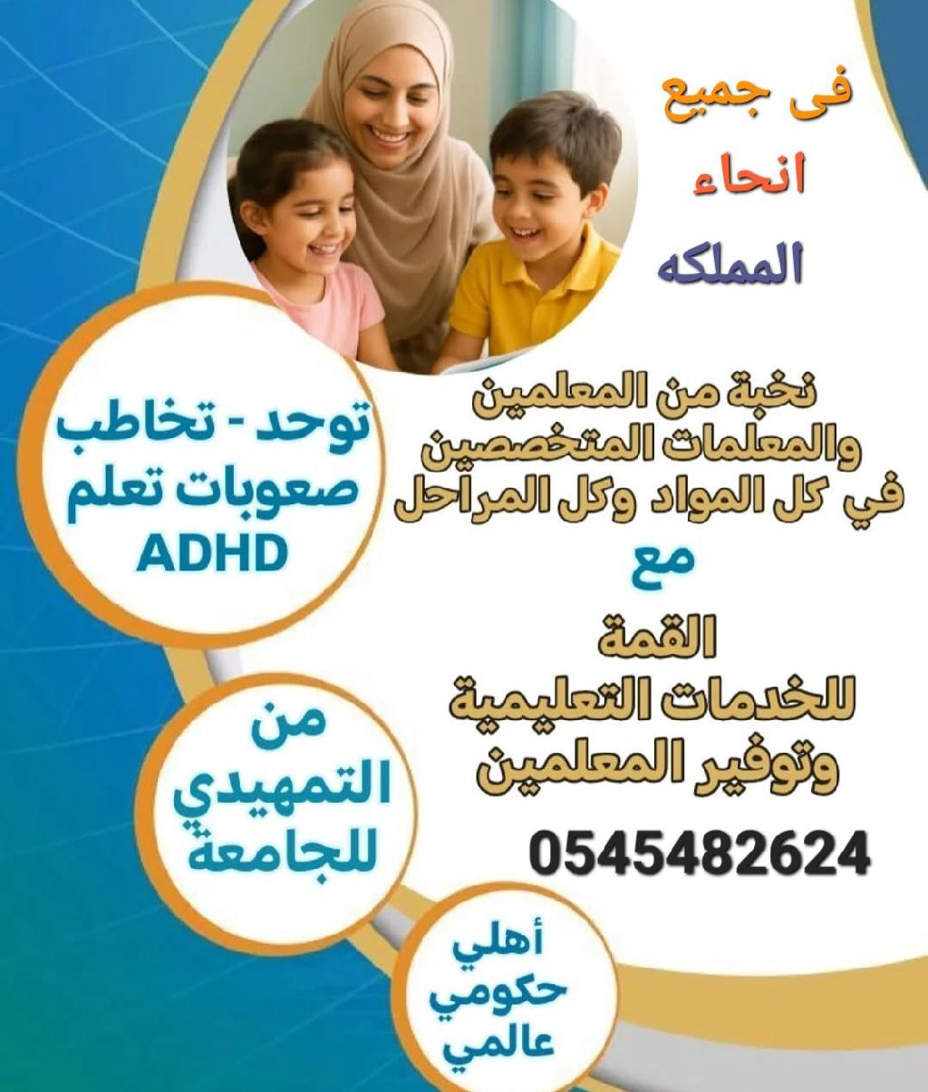 أقوى كادر تعليمي للدروس الخصوصيه في جميع أنحاء المملكة يجون البيت جميع التخصصات وجميع الجنسيات خبرة في مجال التدريس سنوات لجميع المراحل