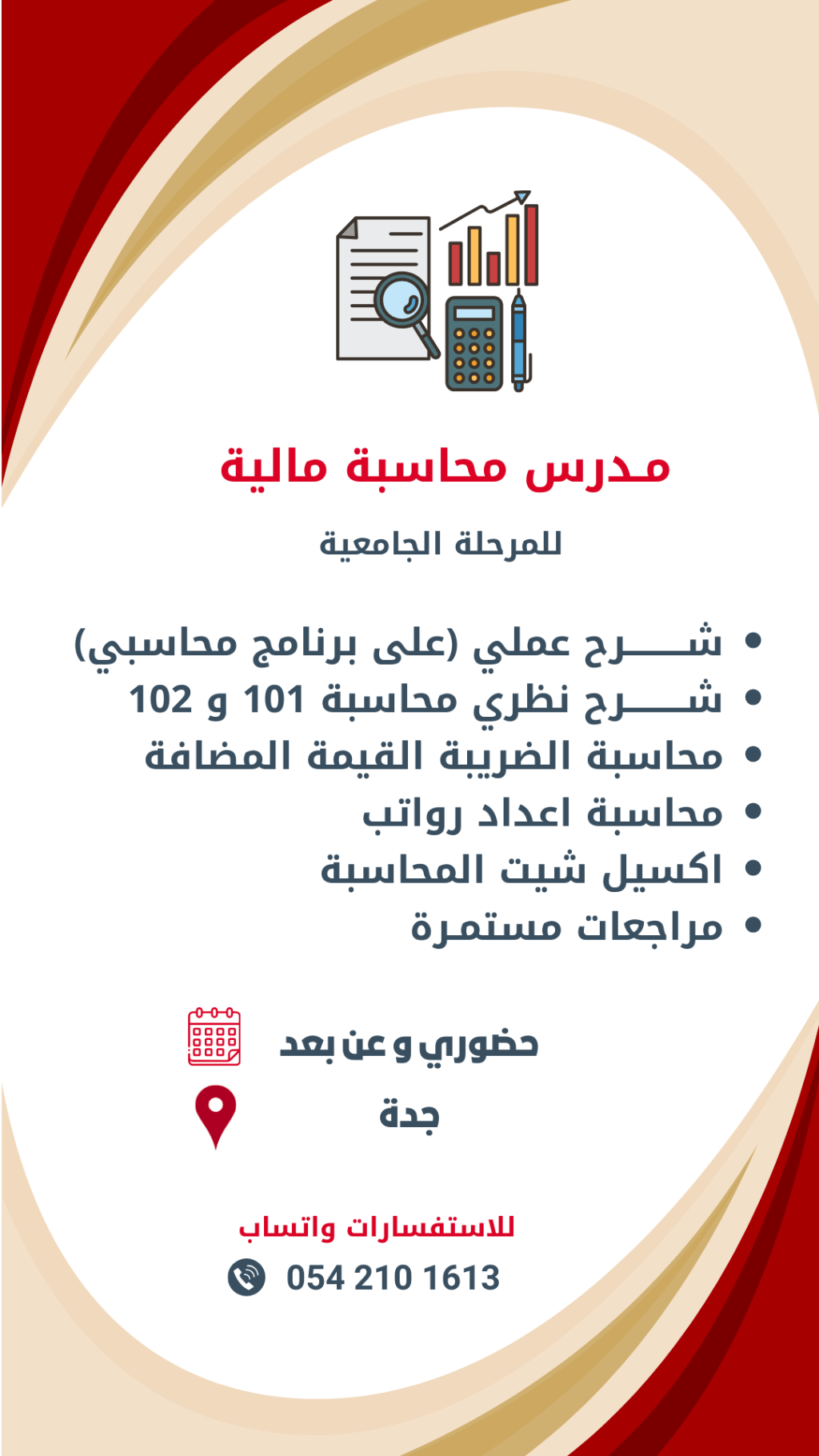 مدرسة محاسبة مالية للمرحلة الجامعية (حضوري - اونلاين) مدينة جدة شرح عملي (على برنامج محاسبي) شرح نظري محاسبة 101 و102 شرح اعداد دليل الحسابات شرح محاسبة الضريبة القيمة المضافة شرح اعداد رواتب شرح أكسيل شيت للمحاسبة مراجعات مستمرة للاستفسارات