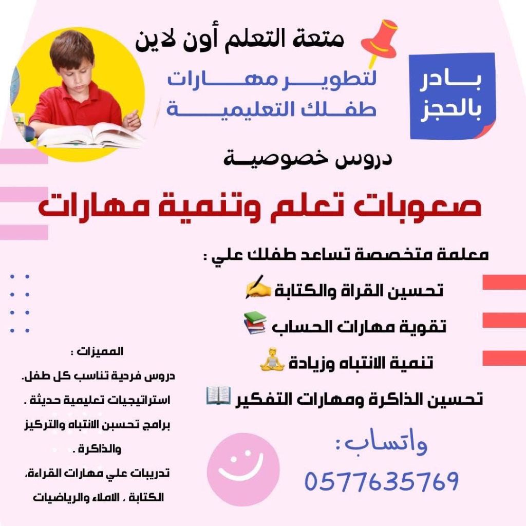 معلمه صعوبات تعلم وتنمية مهارات تحسين القراءة والكتابة تقوية مهارات الحساب تنمية الانتباه تحسين الذاكرة ومهارات التفكير