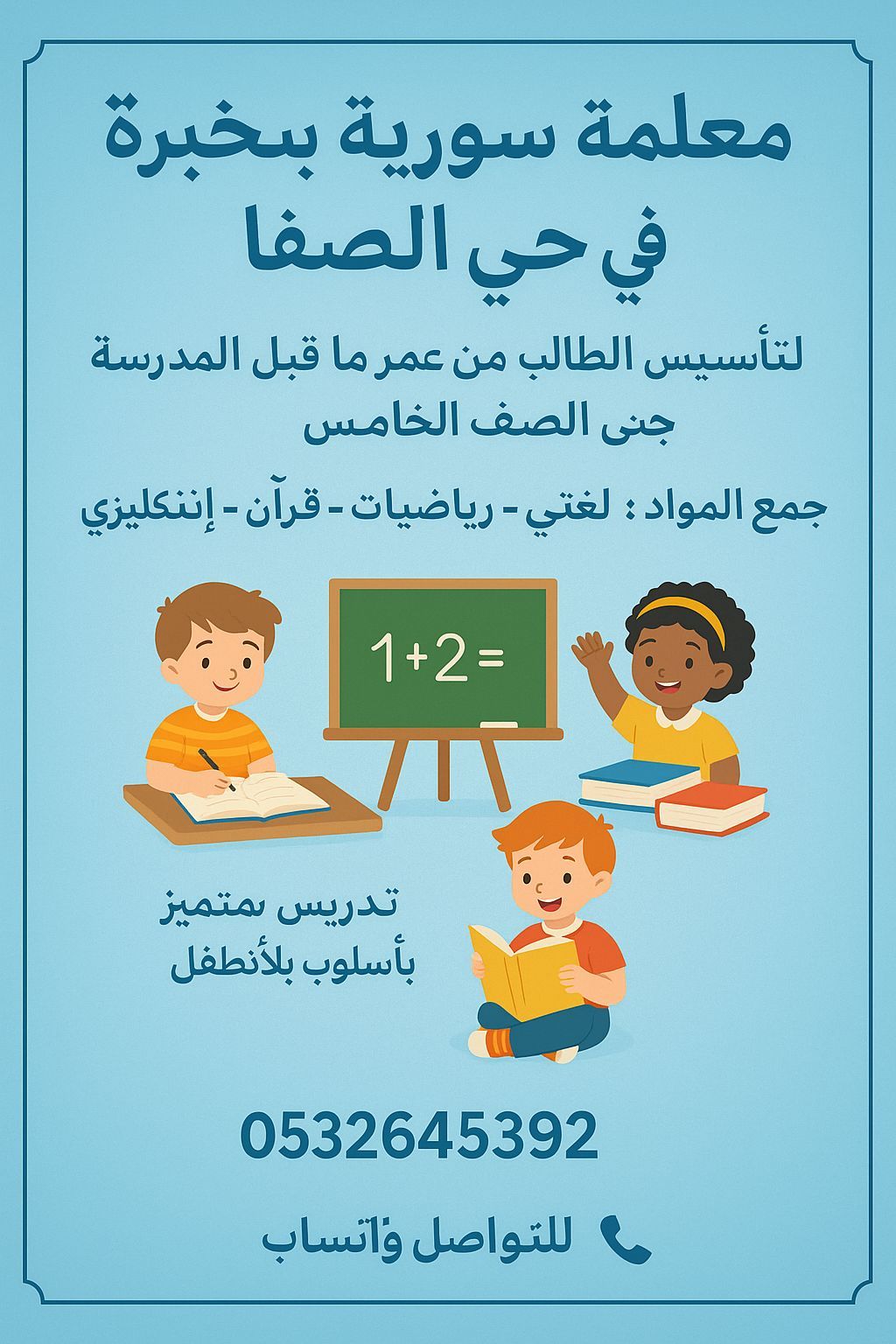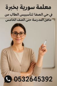Are you looking for a teacher who cares about nurturing your child's development with love and attention A Syrian teacher in Jeddah - Al Safa district. I teach children from kindergarten to the fifth grade in all subjects (Quran with Tajweed - Arabic Language - Math - English - Science - Islamic Education) in a fun and simplified way that suits the child's age. I believe that learning becomes mo